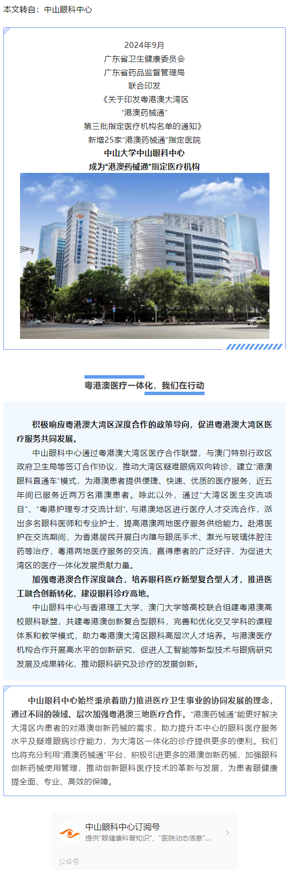 粤港澳医疗|中山眼科中心获批为“港澳药械通” 指定医疗机构---2024-09-14 发布时间:2024-09-14 来源: 作者: