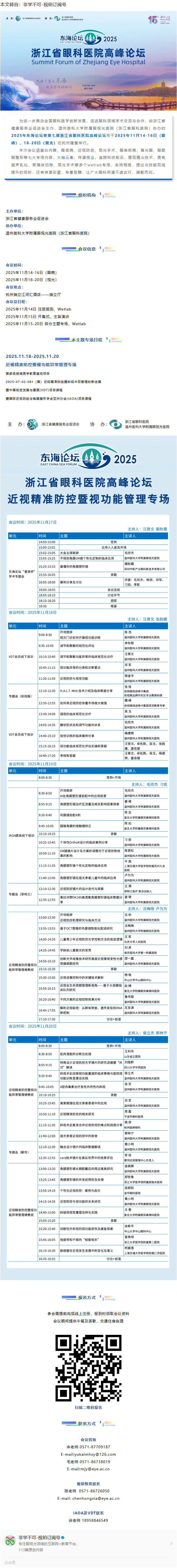 会议日程|东海论坛·2025浙江省眼科医院高峰论坛近视精准防控暨视功能异常管理专场暨继续医学教育、IAOA及VDT线下课程---2025.10.24 发布时间:2025-10-24 来源: 作者: