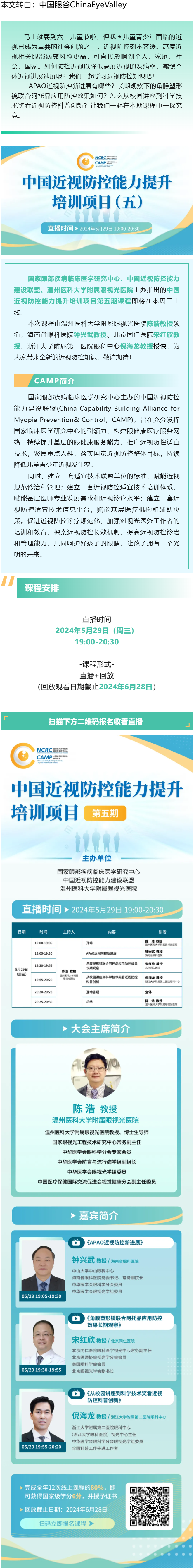 5.29直播 | 中国近视防控能力提升培训课程第五期---2024.5.28 发布时间:2024-05-28 来源:中国眼谷ChinaEyeVall 作者:中国眼谷ChinaEyeVall