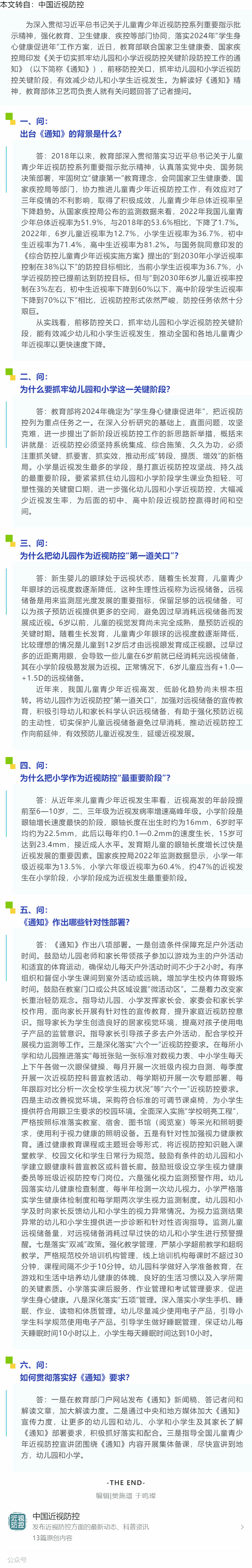为幼儿园和小学近视防控提供科学指导——教育部体卫艺司负责人就《关于切实抓牢幼儿园和小学近视防控关键阶段防控工作的通知》答记者问---2024.11.14 发布时间:2024-11-14 来源:中国近视防控 作者:中国近视防控