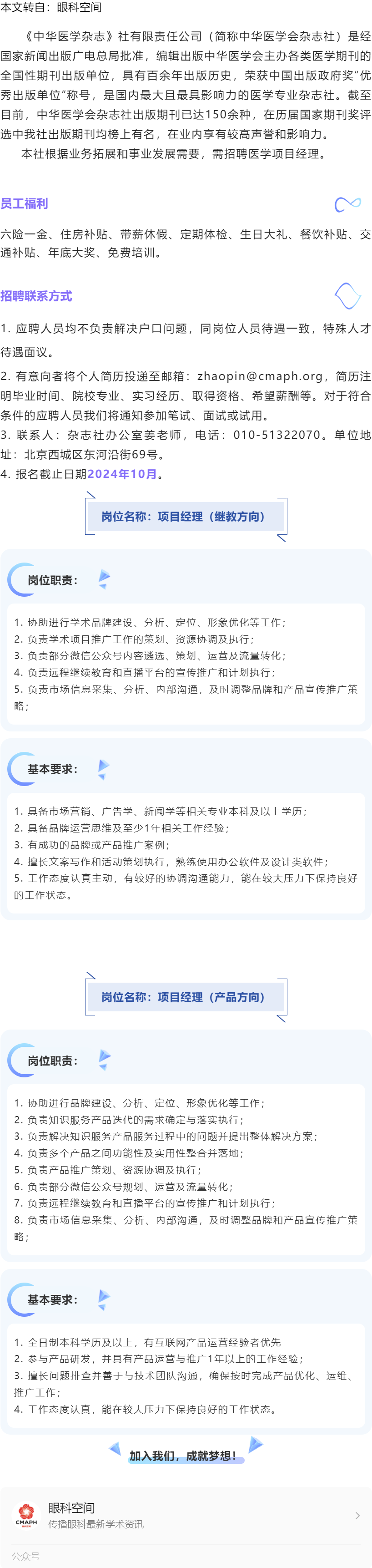 加入我们,成就梦想 | 中华医学会杂志社 市场部项目经理招聘启事---2024.9.20 发布时间:2024-09-20 来源:眼科空间 作者:眼科空间