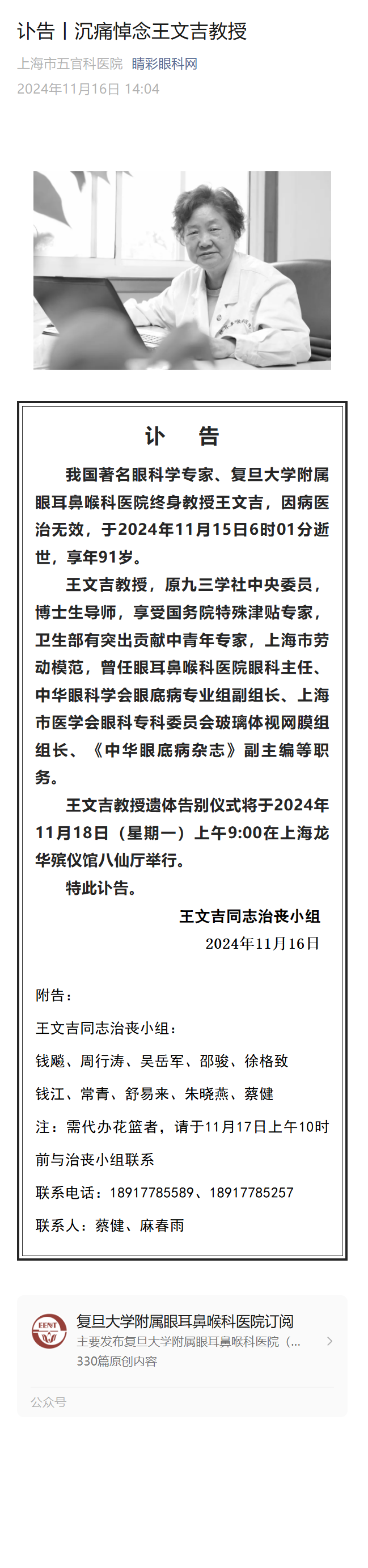 沉痛悼念我国著名眼科学专家王文吉教授----------2024-11-16