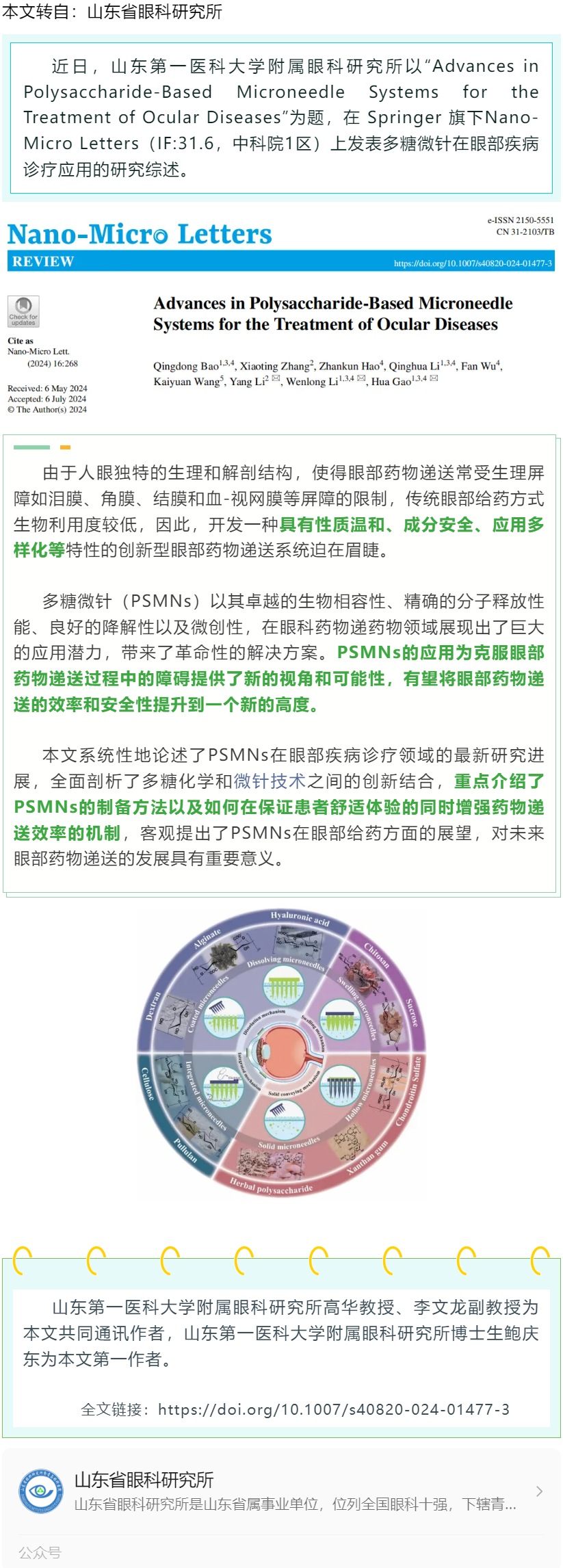 高华教授/李文龙副教授团队发表多糖微针在眼部疾病诊疗应用研究综述---2024.8.27 发布时间:2024-08-27 来源:山东省眼科研究所 作者:山东省眼科研究所