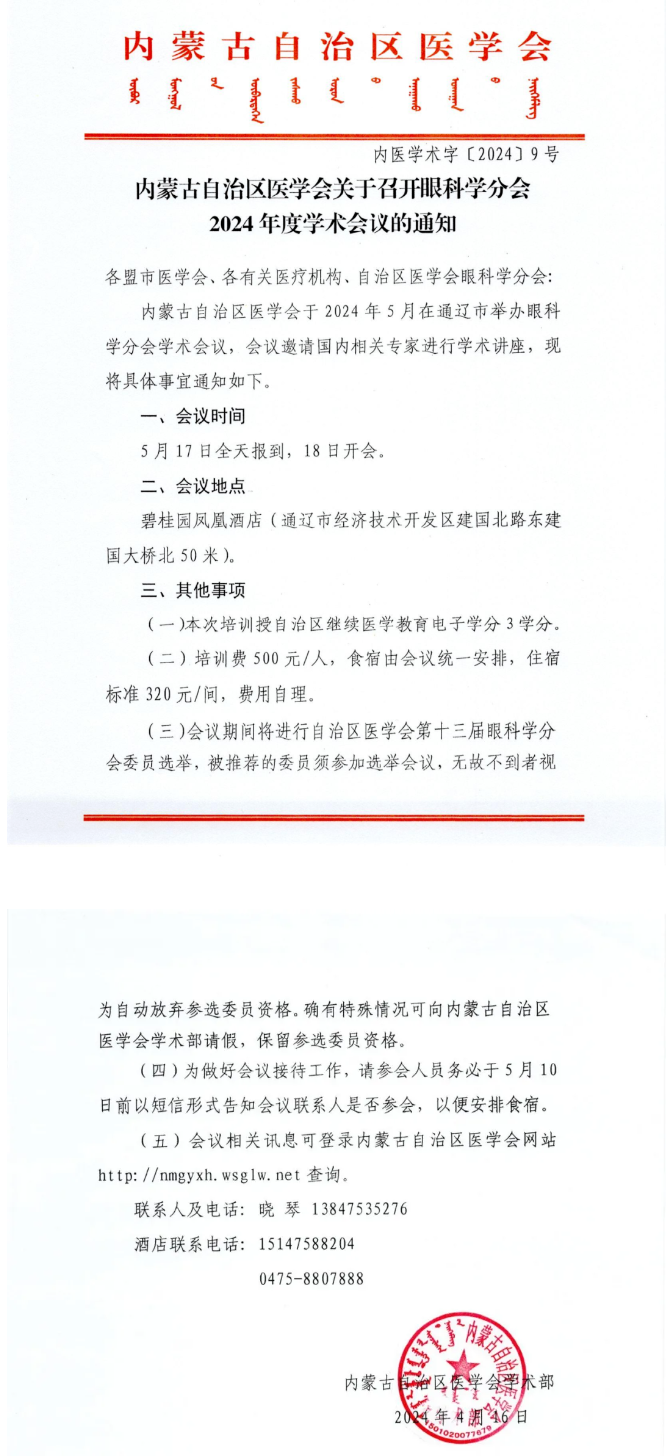5.17-18通辽 | 内蒙古自治区医学会关于召开眼科学分会2024 年度学术会议的通知---2024.5.14 发布时间:2024-05-14 来源:会务组 作者: