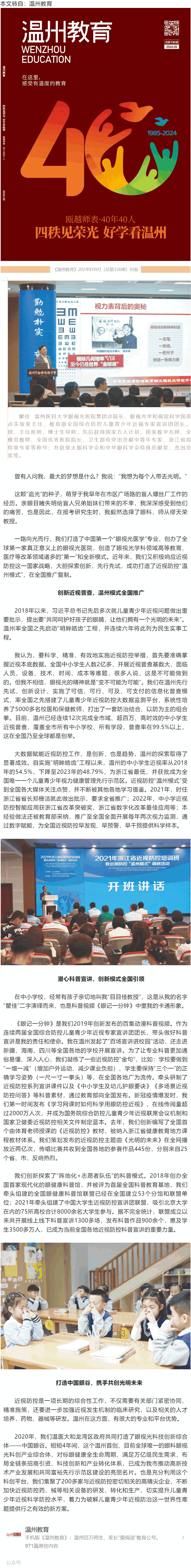 成果示范 | 瞿佳:守护温州百万中小学生的光明未来---2024.10.14 发布时间:2024-10-14 来源:温州教育 作者:温州教育