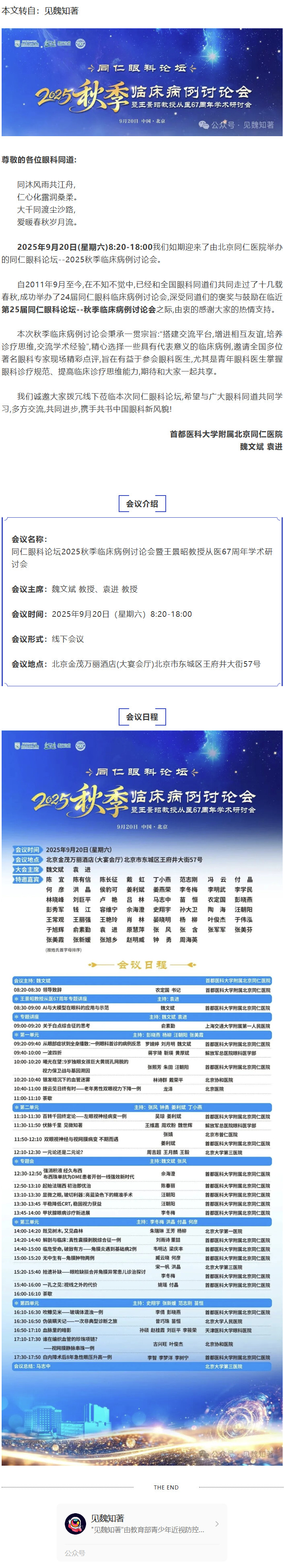 9.20北京| 同仁眼科论坛2025秋季临床病例讨论会暨王景昭教授从医67周年学术研讨会---2025.9.17 发布时间:2025-09-17 来源: 作者: