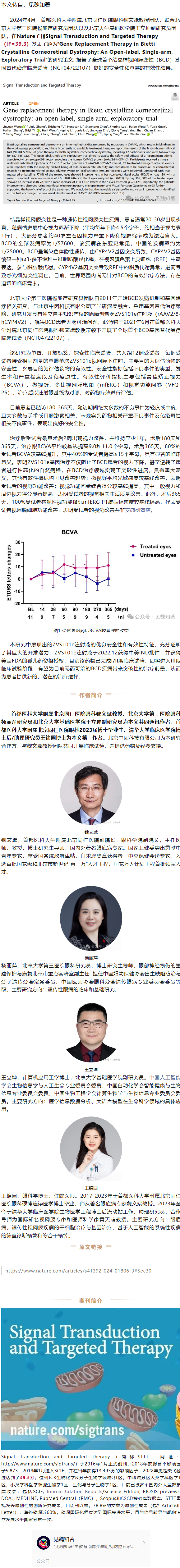 Nature 子刊 | 发表全球首个结晶样视网膜变性基因替代治疗临床研究成果---2024.4.28 发布时间:2024-04-28 来源:见魏知著 作者:见魏知著