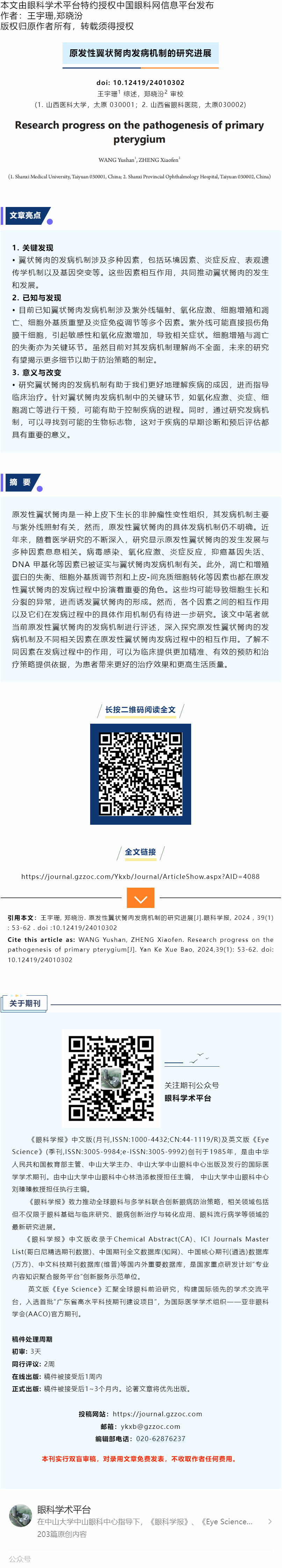 原发性翼状胬肉发病机制的研究进展---2024.11.6 发布时间:2024-11-06 来源:眼科学术平台 作者:王宇珊,郑晓汾