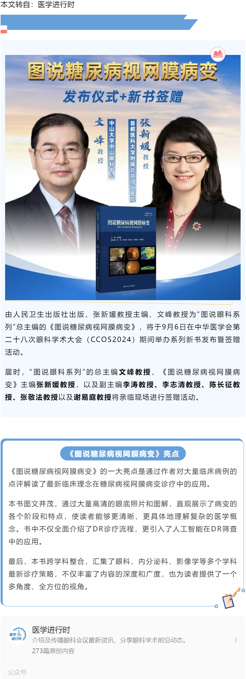 《图说糖尿病视网膜病变》新书发布会及签赠活动将于9月6日亮相2024年全国眼科年会---2024.9.4 发布时间:2024-09-04 来源:医学进行时 作者:医学进行时