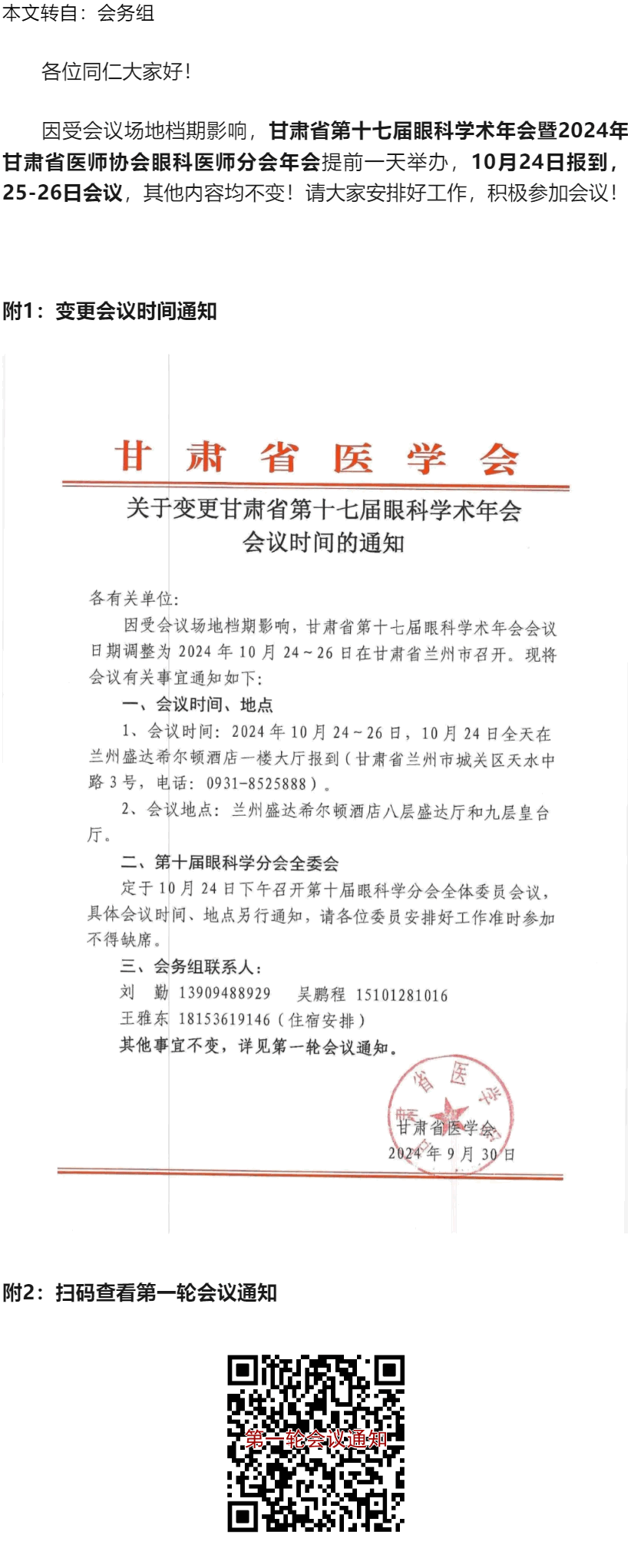 关于变更甘肃省第十七届眼科学术年会暨2024年甘肃省医师协会眼科医师分会年会会议时间的通知(10.24-26兰州)---2024.9.30 发布时间:2024-09-30 来源:会务组 作者:会务组
