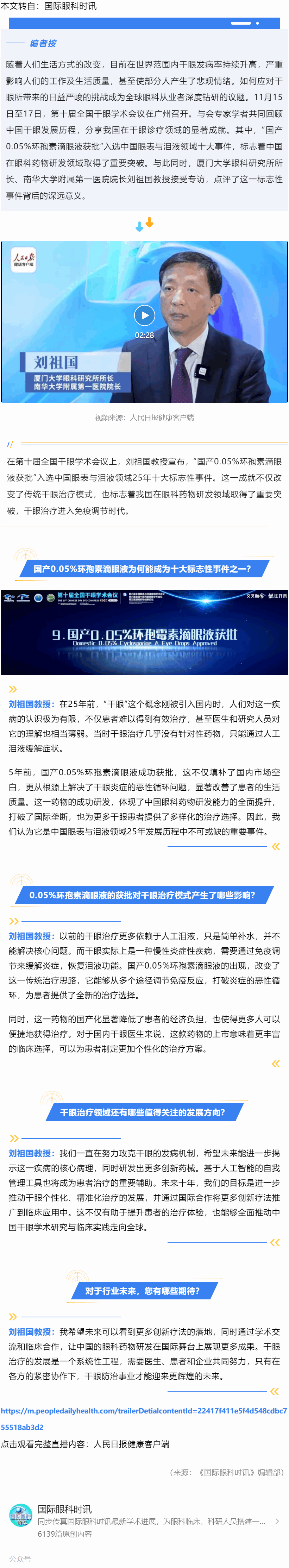 专访刘祖国教授:国产0.05%环孢素滴眼液获批入选中国眼表与泪液领域十大事件---2024.11.21 发布时间:2024-11-21 来源:国际眼科时讯 作者:国际眼科时讯