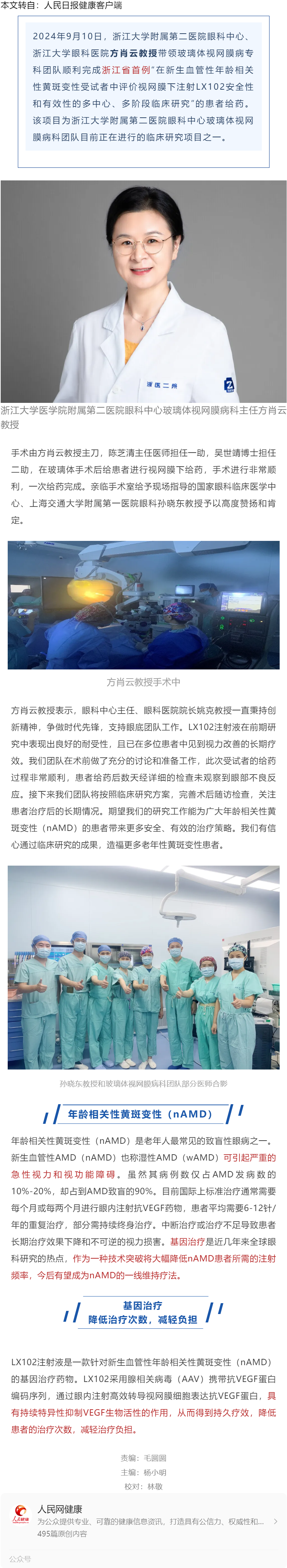 行业峰向 | 浙二眼科玻璃体视网膜团队完成浙江省首例湿性年龄相关性黄斑变性(nAMD)基因治疗给药---2024.9.13 发布时间:2024-09-13 来源:人民日报健康客户端 作者:人民日报健康客户端