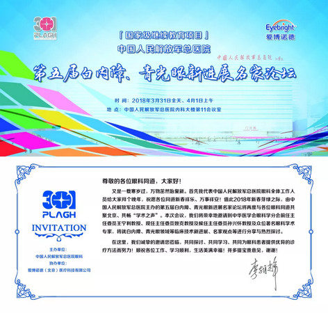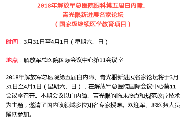新闻中心 您的当前位置:首页 > 新闻中心 > 2018解放军总医院眼科 2018解放军总医院眼科第五届白内障、青光眼新进展名家论坛---------------2018-03-11 发布时间:2018-03-11 来源: 作者: 原文链接 更多新闻请点击: http://www.yanke360.com/news/