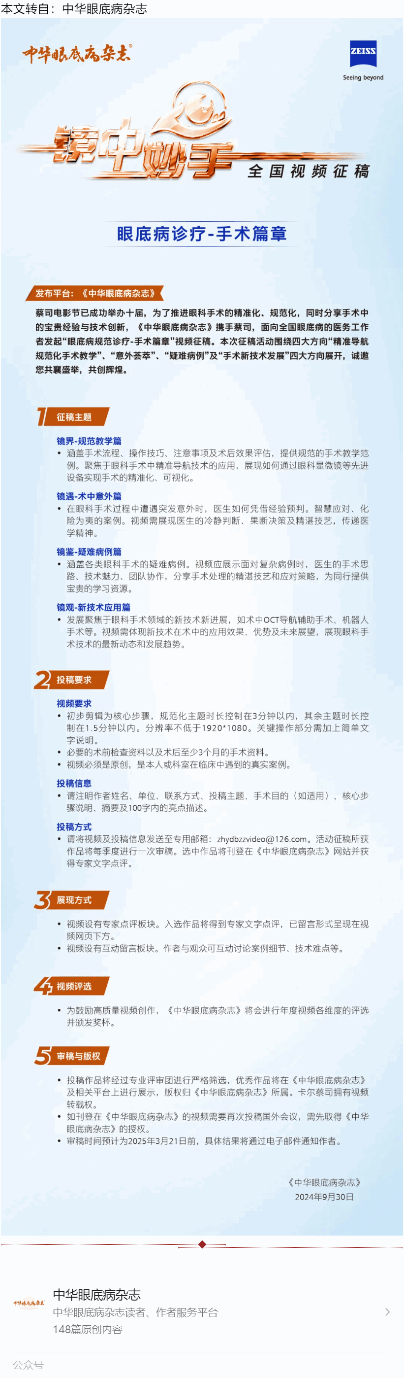 征稿通知 | “镜中妙手”视频栏目(眼底病规范诊疗-手术篇章)---2024.9.30 发布时间:2024-09-30 来源:中华眼底病杂志 作者:中华眼底病杂志