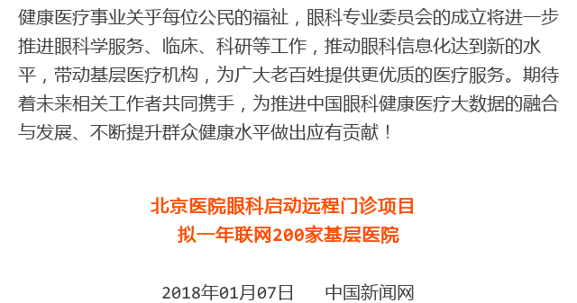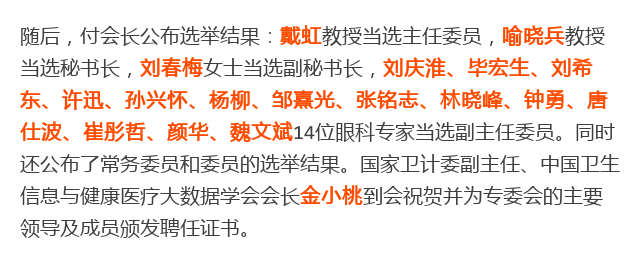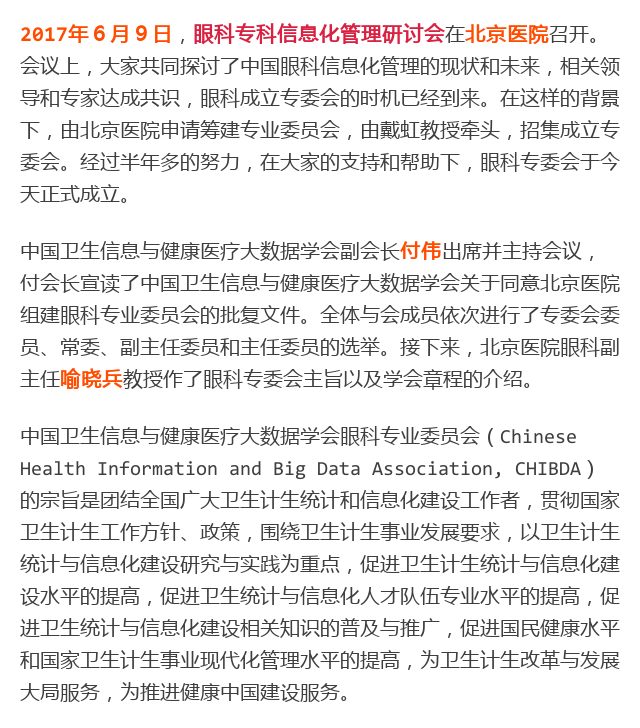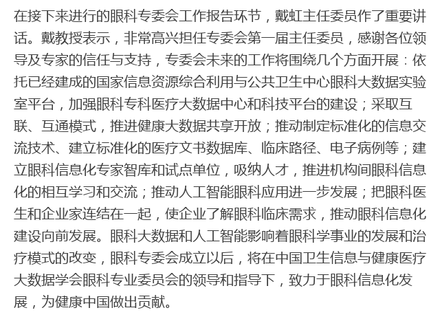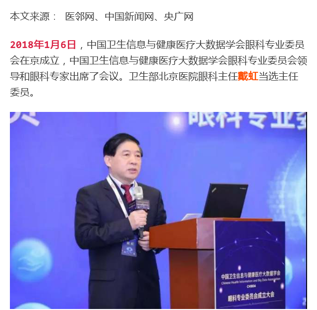 新闻中心 您的当前位置:首页 > 新闻中心 > 中国卫生信息与健康 中国卫生信息与健康医疗大数据学会眼科专业委员会在京成立 戴虹当选主任委员---------2018-01-09 发布时间:2018-01-09 来源: 作者: 原文链接 更多新闻请点击: http://www.yanke360.com/news/
