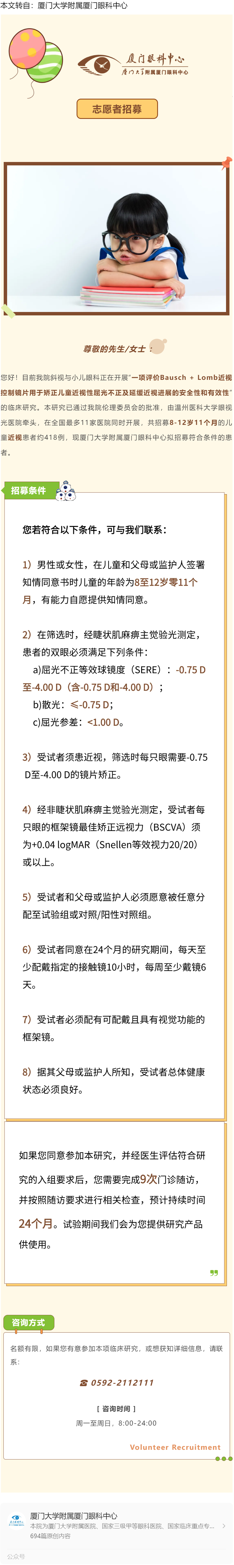 志愿者招募!近视防控新项目,符合这些条件的皆可报名→---2024.8.13 发布时间:2024-08-13 来源:厦门大学附属厦门眼科 作者:厦门大学附属厦门眼科