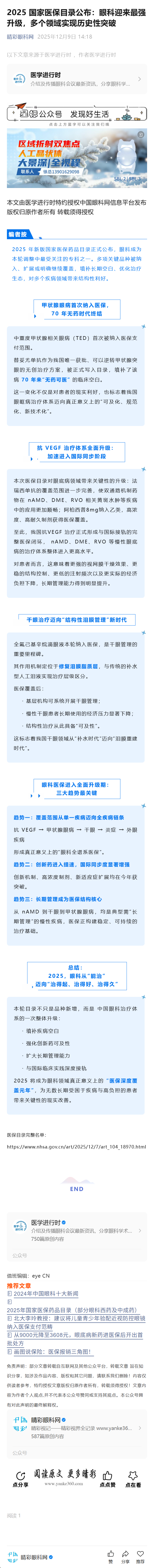 新闻中心 您的当前位置:首页 > 新闻中心 > 2025 国家医保目录公 2025 国家医保目录公布:眼科迎来最强升级,多个领域实现历史性突破-----------2025-12-9 发布时间:2025-12-09 来源: 作者: 原文链接