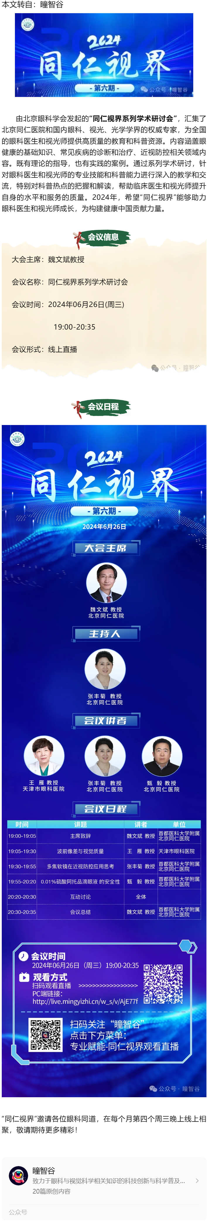 6.26线上 | 同仁视界第六期---2024.6.19 发布时间:2024-06-19 来源:瞳智谷 作者:瞳智谷