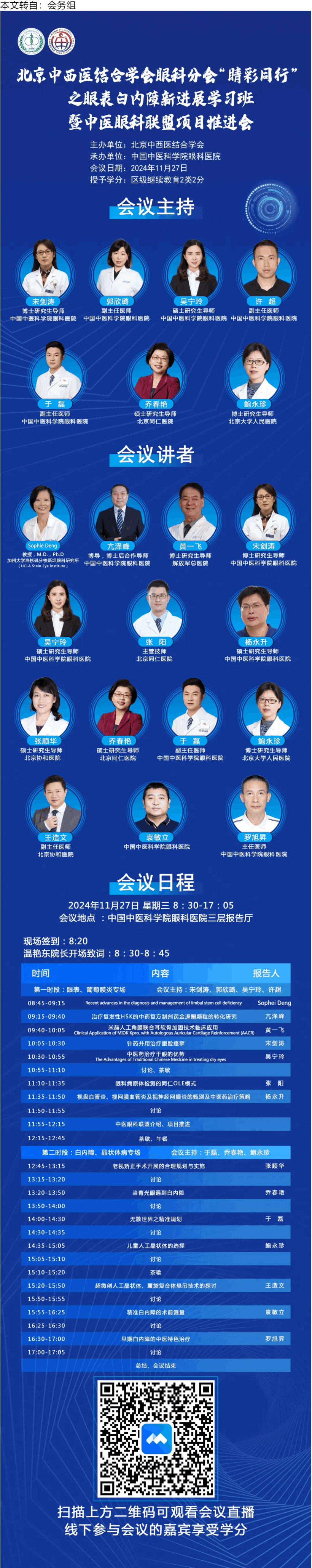 11.27北京 | 北京中西医结合学会眼科分会“睛彩同行”之眼表白内障新进展学习班暨中医眼科联盟项目推进会(线上+线下)---2024.11.25 发布时间:2024-11-25 来源:会务组 作者:会务组
