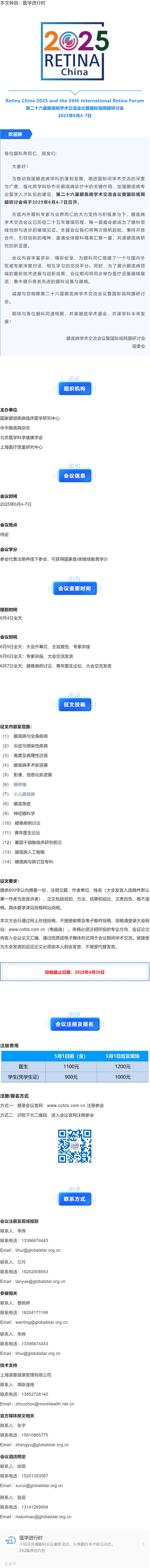 6.4-7丨第二十六届眼底病学术交流会议暨国际视网膜研讨会2025 RETINA China(征文截稿至4.30)---2024.9.24 发布时间:2024-09-24 来源:医学进行时 作者:医学进行时