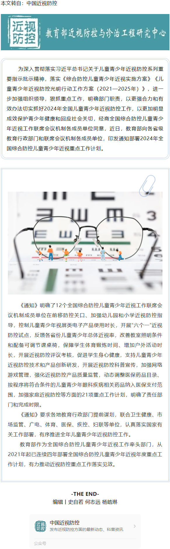教育部划重点了!今年近视防控要重点做好这些工作---2024.5.7 发布时间:2024-05-07 来源:中国近视防控 作者:中国近视防控