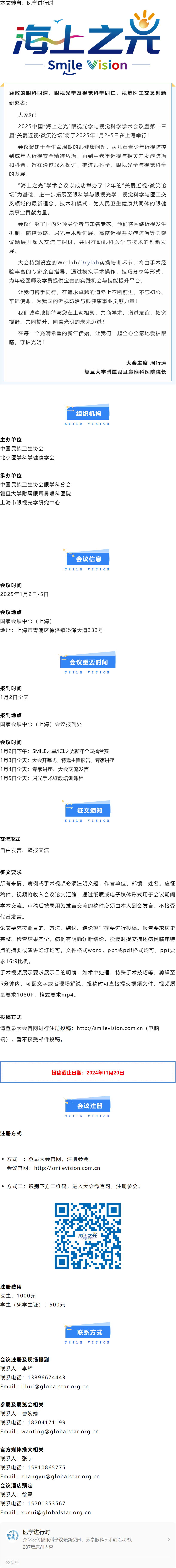1.2-5上海|2025中国“海上之光”眼视光学与视觉科学学术会议暨第十三届“关爱近视·微笑论坛”---2024.9.19 发布时间:2024-09-19 来源:医学进行时 作者:医学进行时