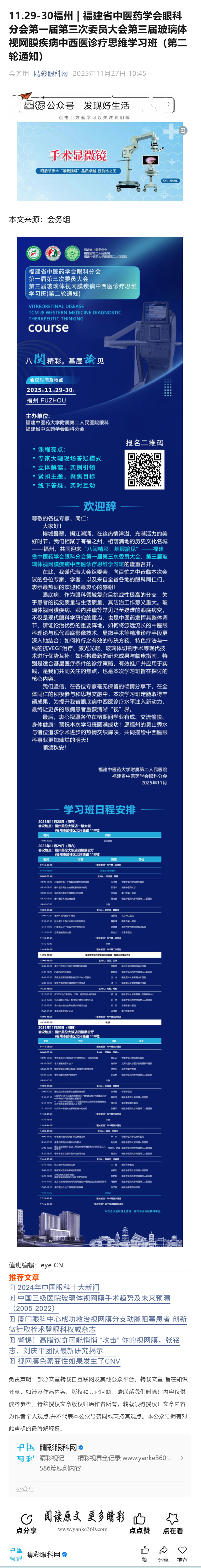 新闻中心 您的当前位置:首页 > 新闻中心 > 11.29-30福州 | 福建 11.29-30福州 | 福建省中医药学会眼科分会第一届第三次委员大会第三届玻璃体视网膜疾病中西医诊疗思维学习班(第二轮通知)----2025-11-27 发布时间:2025-11-27 来源: 作者: