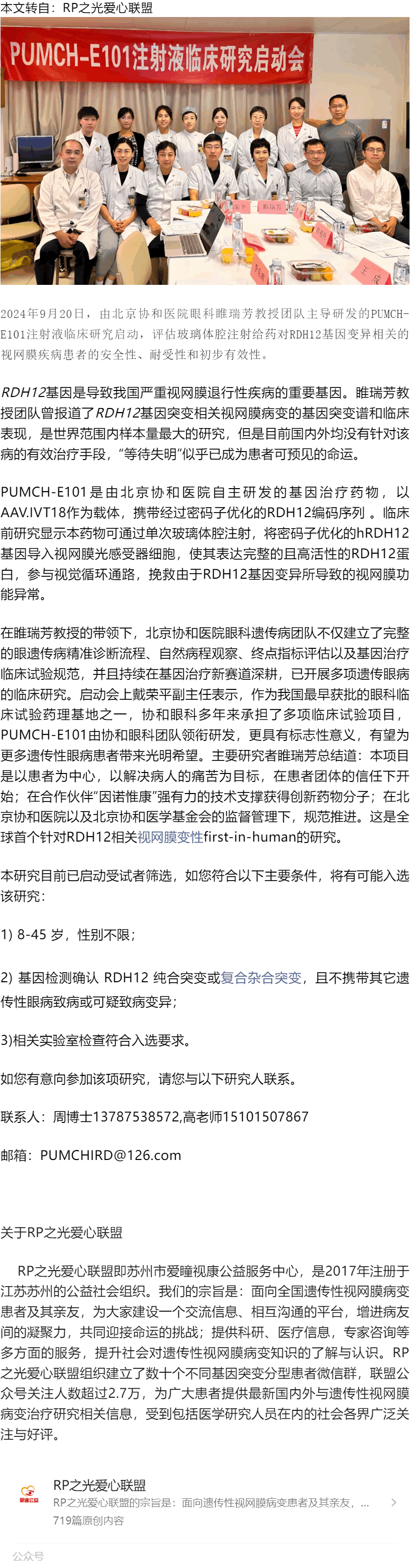 新闻中心 您的当前位置:首页 > 新闻中心 > 北京协和医院启动RDH1 北京协和医院启动RDH12相关视网膜病变基因治疗临床研究---2024.9.25 发布时间:2024-09-25 来源:RP之光爱心联盟 作者:RP之光爱心联盟