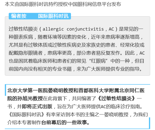 新闻中心 您的当前位置:首页 > 新闻中心 > 匠心凸显,共谱专著; 匠心凸显,共谱专著;精心铸造,服务医患——《过敏性结膜炎》首席主编晏晓明教授专访-----2018-02-27 发布时间:2018-02-27 来源:国际眼科时讯 作者: 原文链接 更多新闻请点击: http://www.yanke360.com/news/