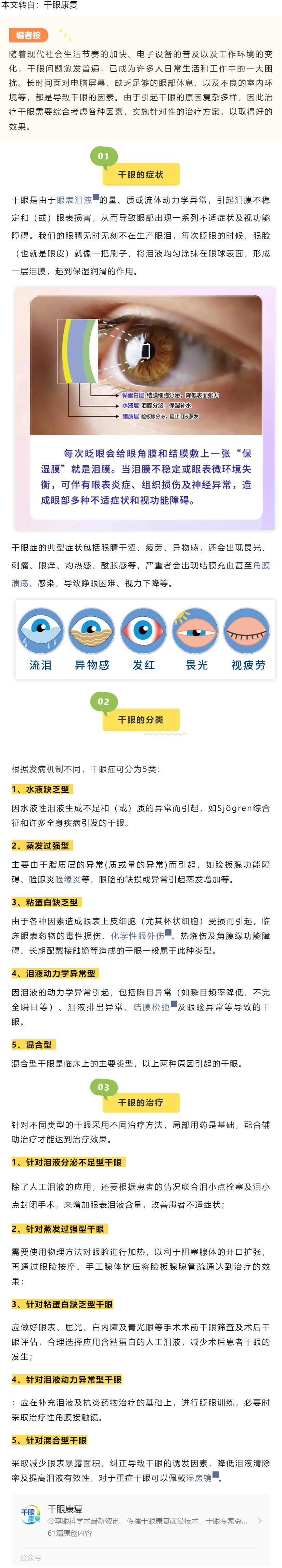 不同类型的干眼症治疗方法不同,一定要对症治疗!---2024.8.21 发布时间:2024-08-21 来源:干眼康复 作者:干眼康复