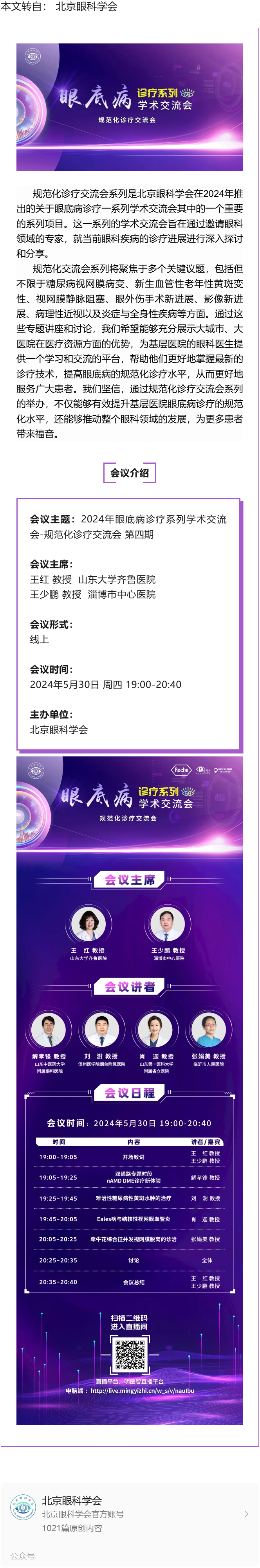 5.30线上 | 2024年眼底病诊疗系列学术交流会-规范化诊疗交流会 第四期---2024.5.29 发布时间:2024-05-29 来源:北京眼科学会 作者:北京眼科学会