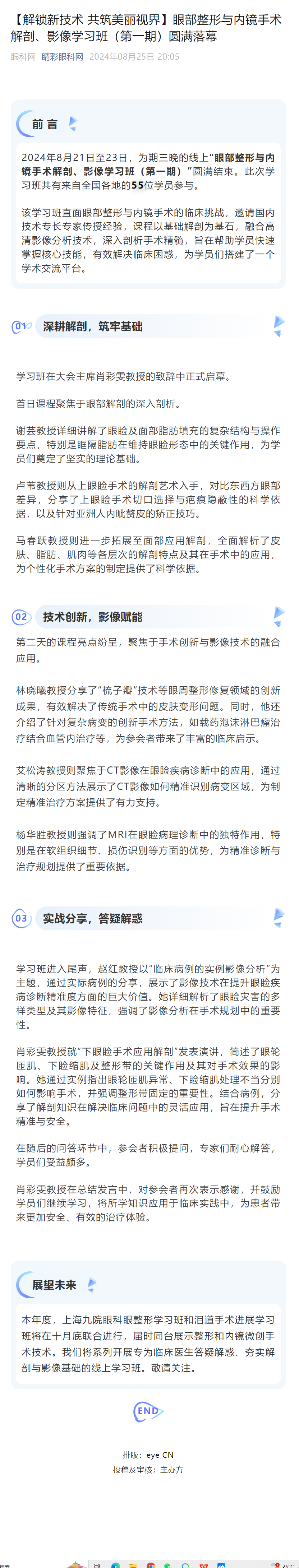 新闻中心 您的当前位置:首页 > 新闻中心 > 【解锁新技术 共筑美 【解锁新技术 共筑美丽视界】眼部整形与内镜手术解剖、影像学习班(第一期)圆满落幕------2024-08-25 发布时间:2024-08-25 来源: 作者: