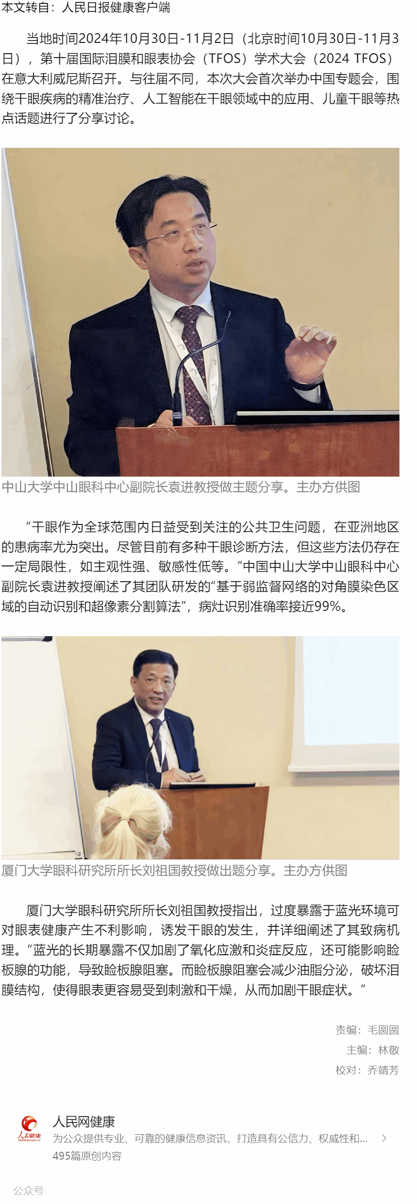 第十届国际泪膜和眼表协会首届中国专题会举办---2024.11.7 发布时间:2024-11-07 来源:人民日报健康客户端 作者:人民日报健康客户端