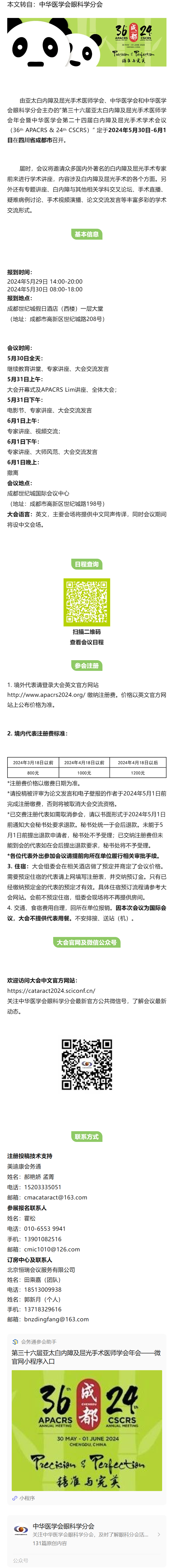 最终日程公布 | 第三十六届亚太白内障及屈光手术医师学会年会暨中华医学会第二十四届白内障及屈光手术学术会议---2024.5.21 发布时间:2024-05-21 来源:中华医学会眼科学分会 作者:中华医学会眼科学分会