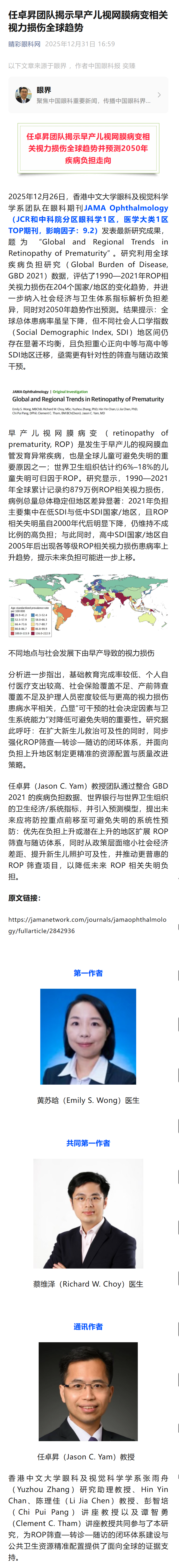 新闻中心 您的当前位置:首页 > 新闻中心 > 任卓昇团队揭示早产儿 任卓昇团队揭示早产儿视网膜病变相关视力损伤全球趋势--------2025-12-31 发布时间:2025-12-31 来源: 作者: