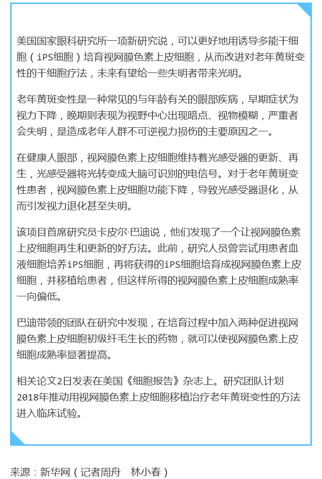 【资讯】美研究有望改进老年黄斑变性干细胞疗法------------------2018-01-08