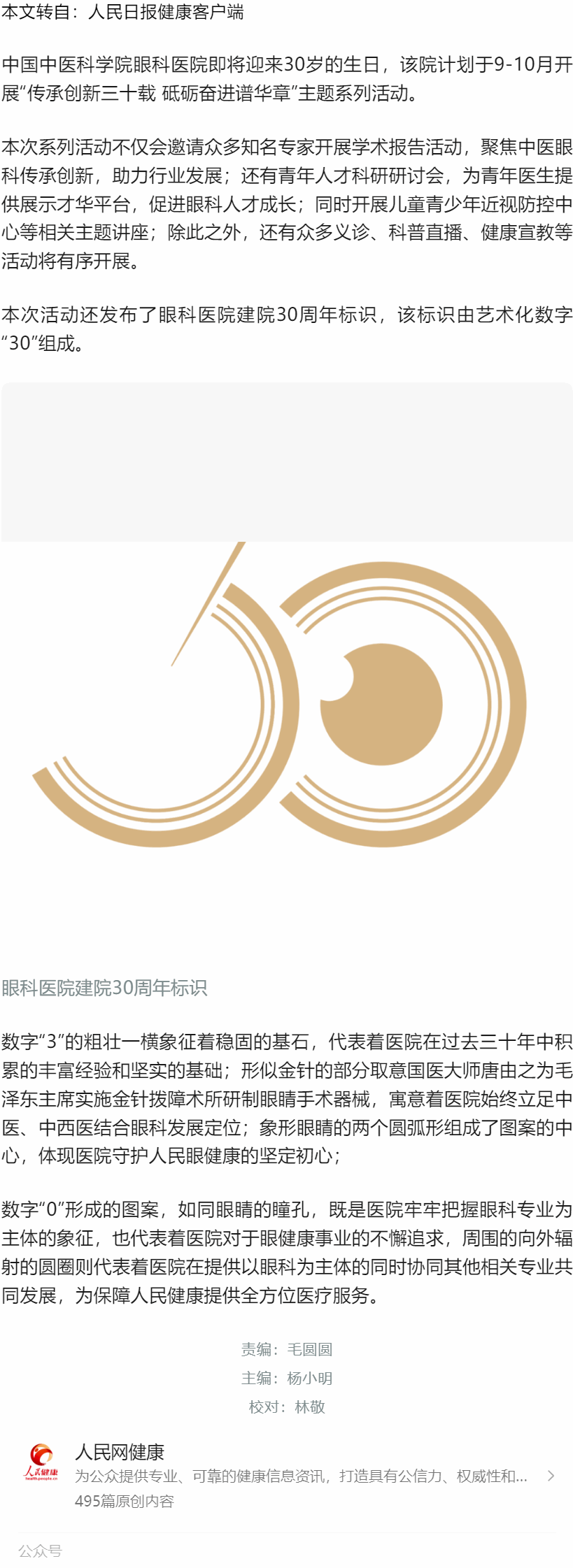 中国中医科学院眼科医院建院30周年,举办系列主题活动---2024.9.26 发布时间:2024-09-26 来源:人民日报健康客户端 作者:人民日报健康客户端