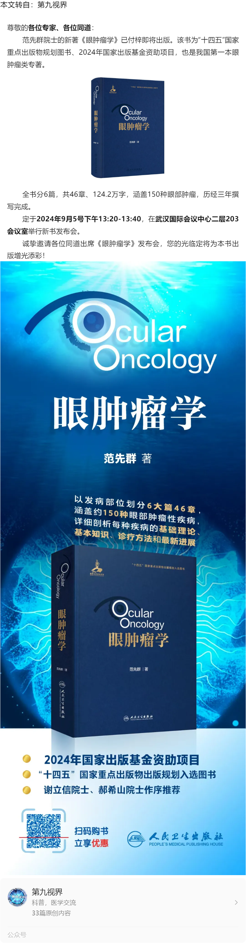 新书发布|范先群院士新著《眼肿瘤学》发布会,诚邀同道出席!---2024.9.3 发布时间:2024-09-03 来源:第九视界 作者:第九视界