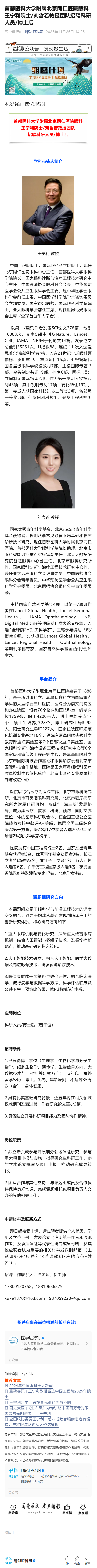 新闻中心 您的当前位置:首页 > 新闻中心 > 首都医科大学附属北京 首都医科大学附属北京同仁医院眼科王宁利院士/刘含若教授团队招聘科研人员/博士后------------2025-11-26 发布时间:2025-11-26 来源: 作者: 原文链接
