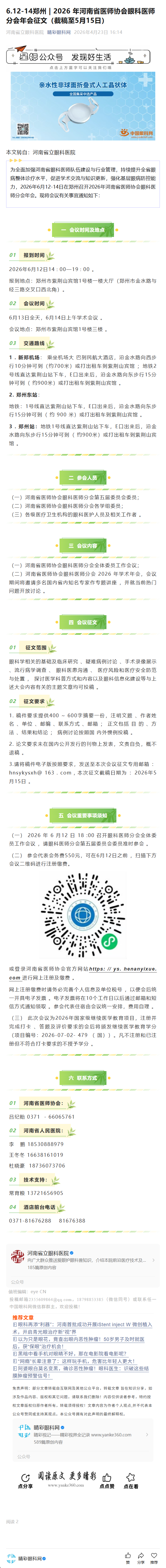 新闻中心 您的当前位置:首页 > 新闻中心 > 6.12-14郑州 | 2026 6.12-14郑州 | 2026 年河南省医师协会眼科医师分会年会征文(截稿至5月15日)----2026-4-23 发布时间:2026-04-23 来源: 作者:
