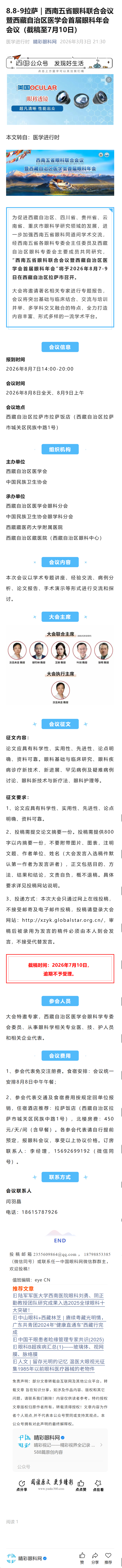 新闻中心 您的当前位置:首页 > 新闻中心 > 8.8-9拉萨|西南五省 8.8-9拉萨|西南五省眼科联合会议暨西藏自治区医学会首届眼科年会会议(截稿至7月10日)------2026-3-3 发布时间:2026-03-03 来源: 作者: