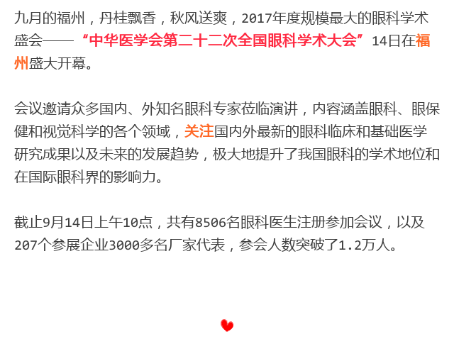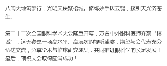 新闻中心 您的当前位置:首页 > 新闻中心 > 【聚焦年会】2017年中 【聚焦年会】2017年中华医学会第二十二次全国眼科学术大会盛大开幕(09.14 福州)---------------------2017.09.15 发布时间:2017-09-15 来源: 作者: 原文链接 更多新闻请点击: http://www.yanke360.com/news/