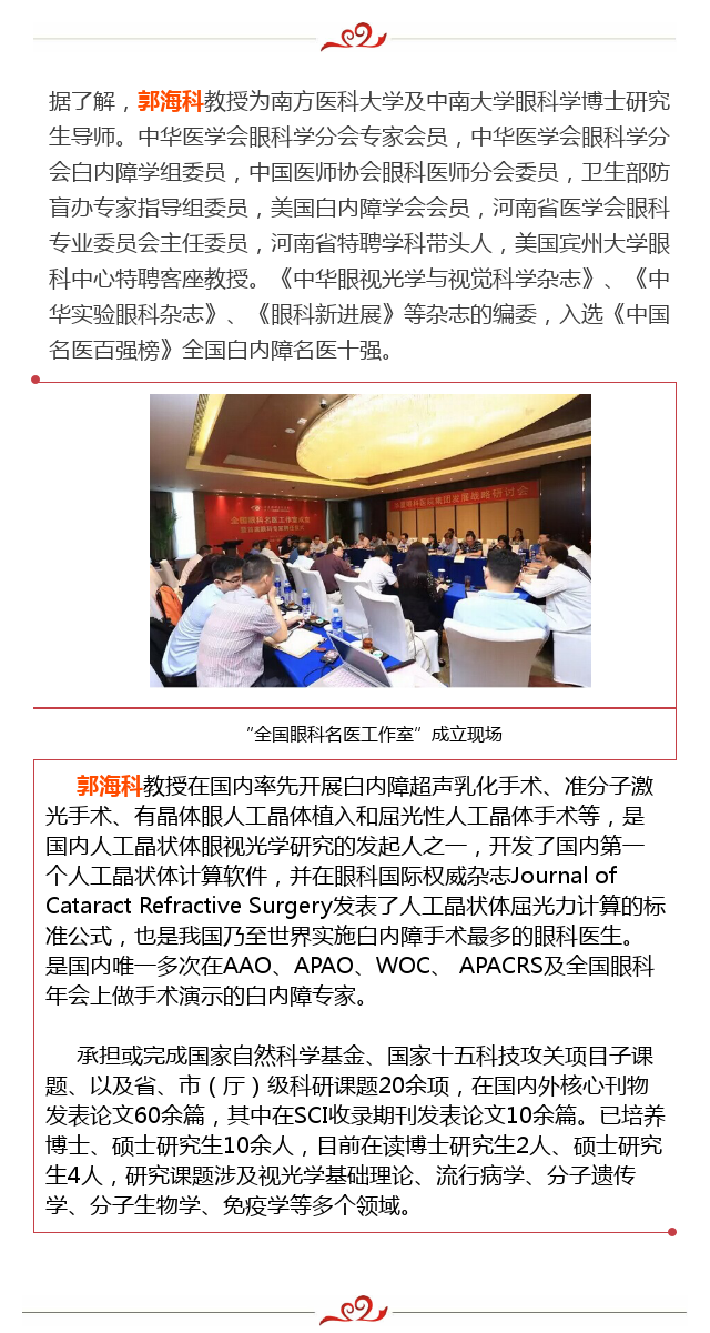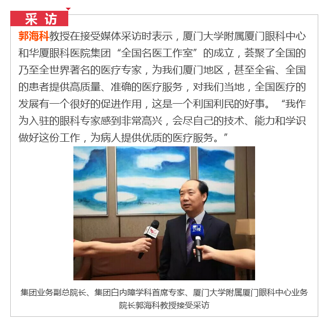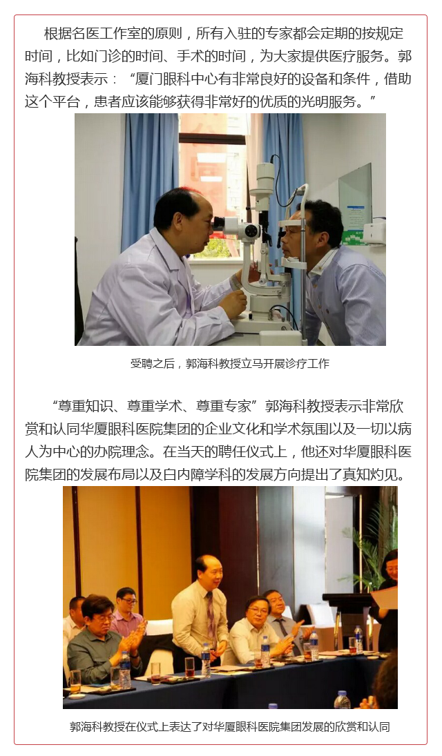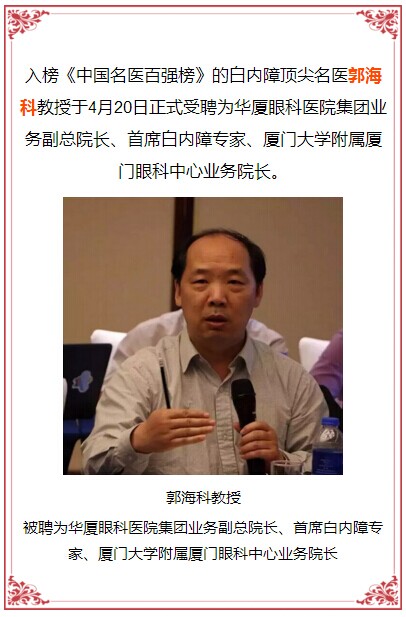 新闻中心 您的当前位置:首页 > 新闻中心 > 郭海科教授正式加盟华 郭海科教授正式加盟华厦眼科,担任副总院长兼首席白内障专家---------------------------2017-04-24 发布时间:2017-04-24 来源:华厦眼科医院集团 作者: 厦门眼科中心 本文由华厦眼科医院集团特约授 权中国眼科网信息平台发布 原文链接 更多新闻请点击: http://www.yanke360.com/news/