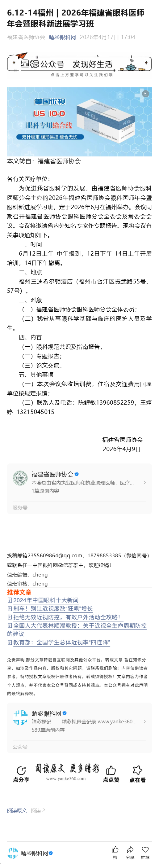 新闻中心 您的当前位置:首页 > 新闻中心 > 6.12-14福州 | 2026年 6.12-14福州 | 2026年福建省眼科医师年会暨眼科新进展学习班-----2026-4-17 发布时间:2026-04-17 来源: 作者: