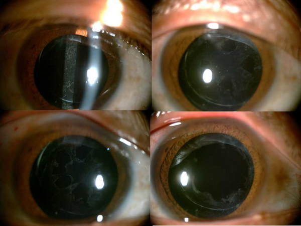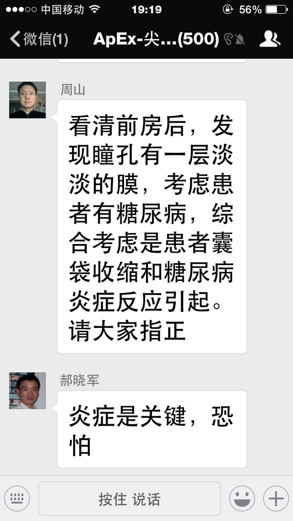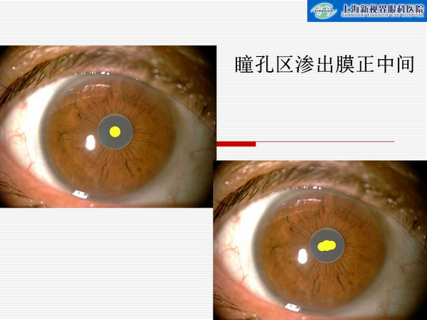 一定注意:用一个激光脉冲,将瞳孔正中央的渗出膜打开一个小洞就可以了。一定不要过多,尽量不要补打激光。并且不要靠近瞳孔领的虹膜组织,否则激光刺激虹膜组织,反应加重,重新渗出,阻塞切口。当打开后,眼压降下来,眼睛病情平稳,局部滴激素眼药水,瞳孔区的渗出膜会慢慢的逐渐地吸收,一般3~4周左右吸收。尽量不要再用激光过多的击打刺激,靠其自然慢慢地吸收为好。