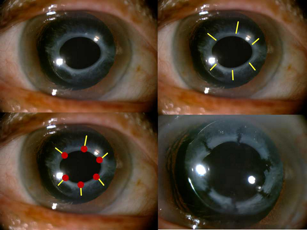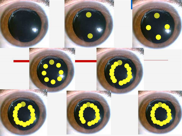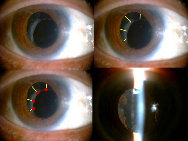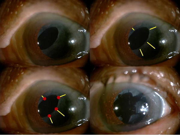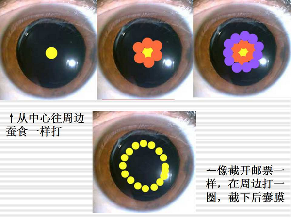 2、对高危人群定期随访:特别是术后2周~3个月之间的多次随访,更要及时,做到早发现早治疗。这个问题最近几年已经得到明显的认识和重视了。我曾经有过一个视网膜色素变性患者,白内障术后3周,撕囊口就皱缩到1~2mm,发展非常之快。3、轻、中度前囊皱缩综合症,可以YAG激光治疗; 4、如果增殖膜非常厚,只有手术;如果增殖膜非常厚,YAG激光打不开了,只有用手术方法剪除了。手术之前,可以用YAG激光先打开一个或几个点或缺口,这样手术更加好操作,更容易剪除前囊皱缩环。(第二点)我还是建议随访为主,对高危人群早期密集随访,如果发现早期皱缩增殖,或有皱缩倾向,需要及时用YAG激光切开松解,这也是我的(第三个)观点。几天前在一个全国白内障群里面,关于出现前囊皱缩综合症的病例,或者出现前囊皱缩综合症倾向的病例,是早起打激光还是观察等待?等到病情加重以后再打激光?这些问题还进行过讨论。我的观点是:打YAG激光越早越好。越早,前囊皱缩越轻,囊袋和悬韧带被牵拉的程度越小,还没有出现副损伤。不要等到前囊皱缩加重,并发症出现了再补救性地打激光。而且前囊增殖膜越薄,YAG激光所用的能量越低,反应越轻,激光的副损伤也越小。需要说一点,前囊下上皮细胞呈白色增殖膜,其前囊膜还是透明的,只是下面的增殖膜牵拉将其拉成很小的孔,并可能牵拉造成部分悬韧带被拉断。YAG激光怎么样打开前囊皱缩环?我的方法选择尽量少的3~6条切口,先预切开几个切口的腹部,保留皱缩口边缘一点点连接,最后再快速击断几个连接点。否则当完全切开一侧的时候,力量不平衡以后,另一侧的收缩将增殖皱缩环拉向周边,再加上激光刺激虹膜,瞳孔可能会缩小遮挡,这次就不能够完成治疗了。(部分病例图片,黄线代表切开部位,红色点代表最后一次爆破点)
