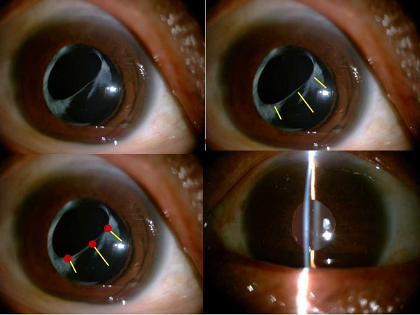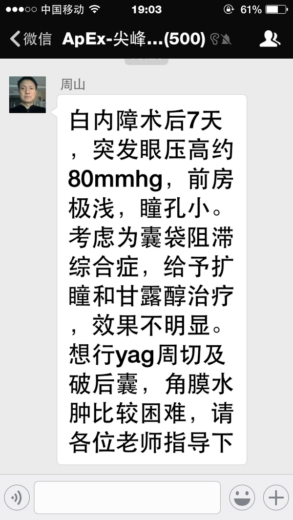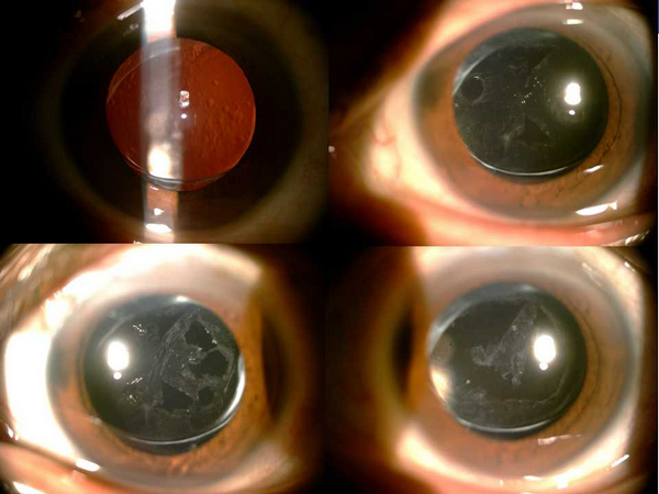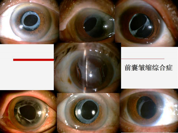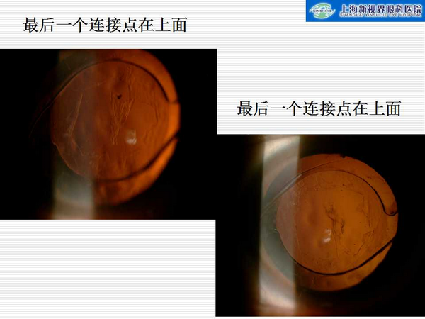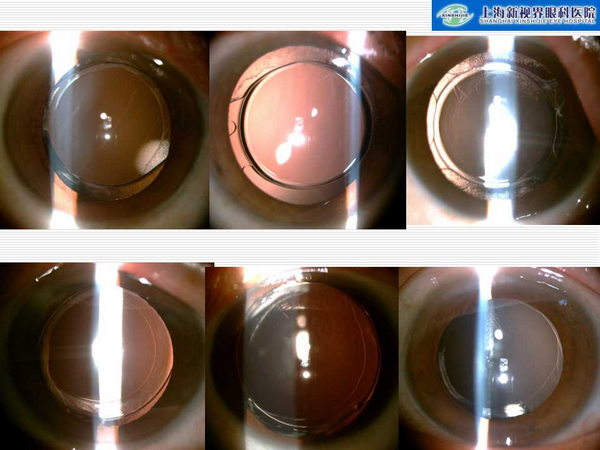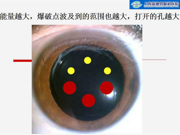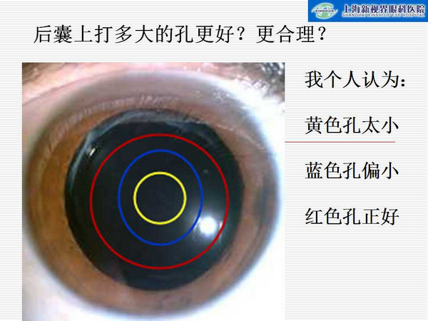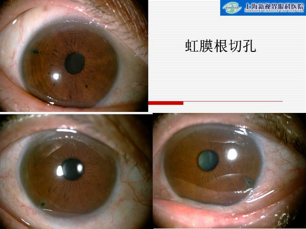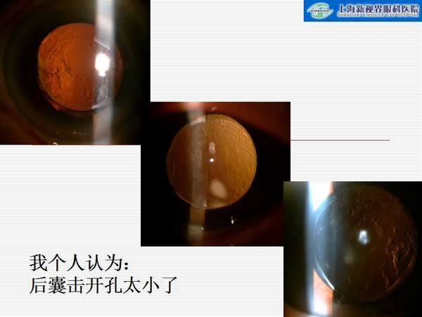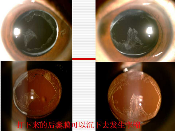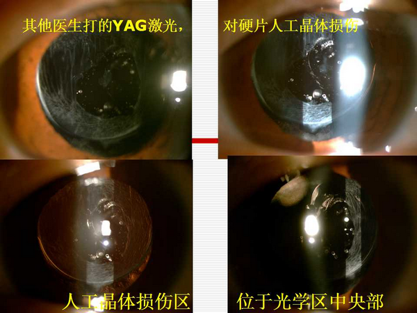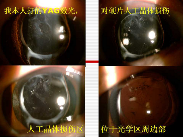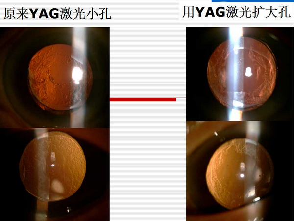 (最后一张图片就是由于YAG激光刺激虹膜,造成瞳孔缩小遮挡)有的时候可以看到透明的前囊膜被打开,增殖挛缩的机化膜分离或截断飘起落入房角或虹膜后方。如果反应不重,我认为不需处理,只局部滴激素和降眼压的眼药水观察就可以。有时候YAG激光后,前房大量碎屑溅起飘落阻塞房角,将会出现继发青光眼。建议术前要考虑全面,需要谈话,做好前房穿刺的可性和术前准备,包括结膜囊抗炎。如果打完激光后,发现有大量的碎屑溅起飘落,应及时做前房穿刺冲洗,患者会很平静。如果出现继发青光眼症状后再谈话,再进行前房穿刺冲洗,治疗上显得被动,患者和家属也会有意见。三、激光虹膜根切术也是临床常用的治疗:由于虹膜有色素,吸收能量较多,故能量勿需太大。位置也不要求一定要位于极其周边近房角处。如果有出血和色素飘起,遮挡视野,可用前置镜压迫眼球止血,建议停1~2天,吸收后再打,有的时候不慎伤及角膜内基质层,也勿需担心害怕,一般1~2天角膜会恢复,第二次打的时候需要注意。再次强调:打的方位一定要在上下方眼睑遮挡处,如果在睑裂处,可能会对视力造成影响!经常看到有的医院、有的医生把虹膜根切口还是打在睑裂方位处。
