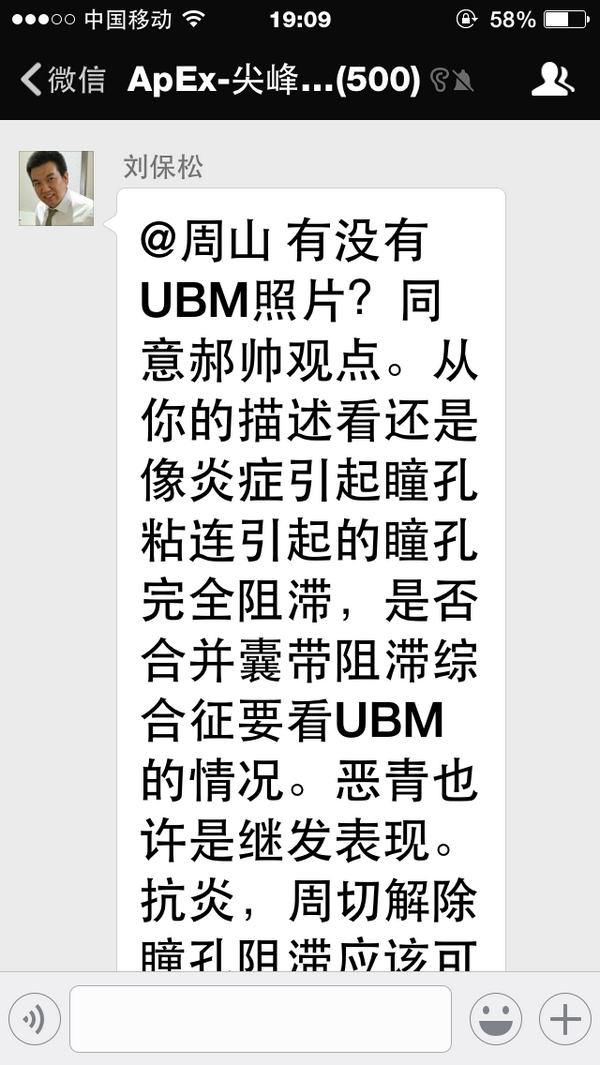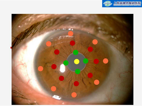 有人认为应该打在虹膜腹部或周边(红色或者粉色的标记点),当打开后,房水流入前房,前房形成建立,房角开放,眼压降低。可是第二天,虹膜击开口又被炎症渗出物阻塞,眼压又升高。而且激光打的越多,反应越重,如果打在瞳孔渗出膜与瞳孔领交界处(绿色标记点),情况与上述相仿。当瞳孔缘与后方人工晶体发生360度后粘连,造成瞳孔阻滞,但人工晶体表面没有渗出膜时,也只有打在虹膜腹部(红色的标记点),解决前后房的交通。我经过数例观察治疗,发现此时大部分病人瞳孔区都有渗出膜存在并前移,我认为打在瞳孔渗出膜正中央处最安全,效果最好。我们可能担心,瞳孔后面就是人工晶体,激光是不是会伤到人工晶体?其实大可不必担心,因为此时,瞳孔闭锁,虹膜组织和瞳孔区的渗出膜在后房的高压力下向前膨隆,明显突起,离人工晶体表面很远,UBM检查应该会支持我的观点并帮助我们鉴别。此时选在瞳孔渗出膜的正中央,用一个脉冲击开,打开前后房交通,解决房水流通问题,如果需要,可以再用1~2个脉冲扩大击开口。