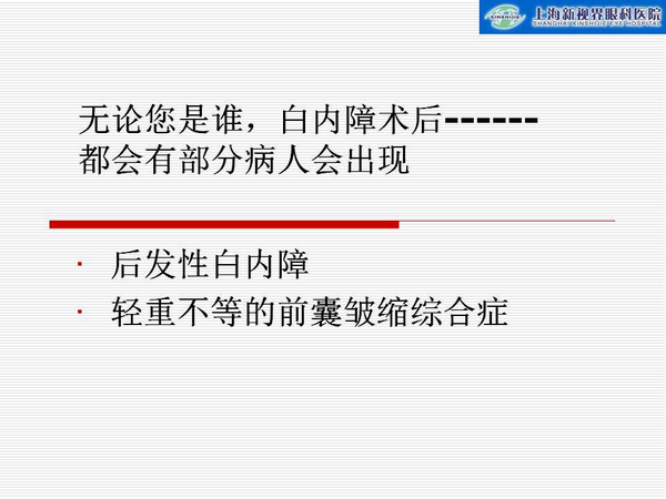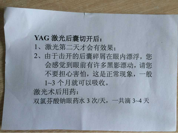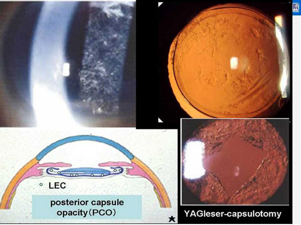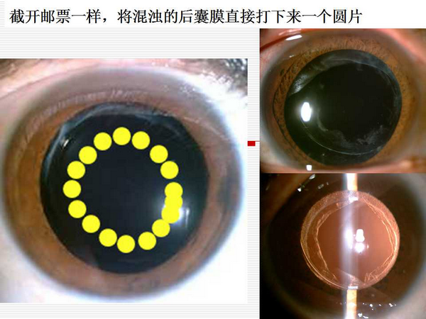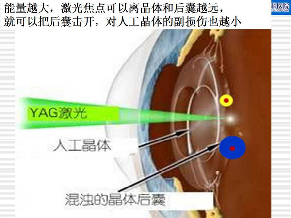 白内障术后由于炎症反应,人工晶体表面可能会有渗出物沉积附着,对术后病情稳定3个月~半年以上的患者,可以用YAG激光清除。方法为:激光聚焦点在人工晶体光学区前部,采取一个高能量激光脉冲爆破,靠激光爆破向周围产生的冲击波,把人工晶体表面的渗出沉积物震荡清除下来。只要激光焦点应用正确,一般不会伤及人工晶体光学区的,非常安全。只是注意不要干扰虹膜组织。