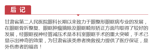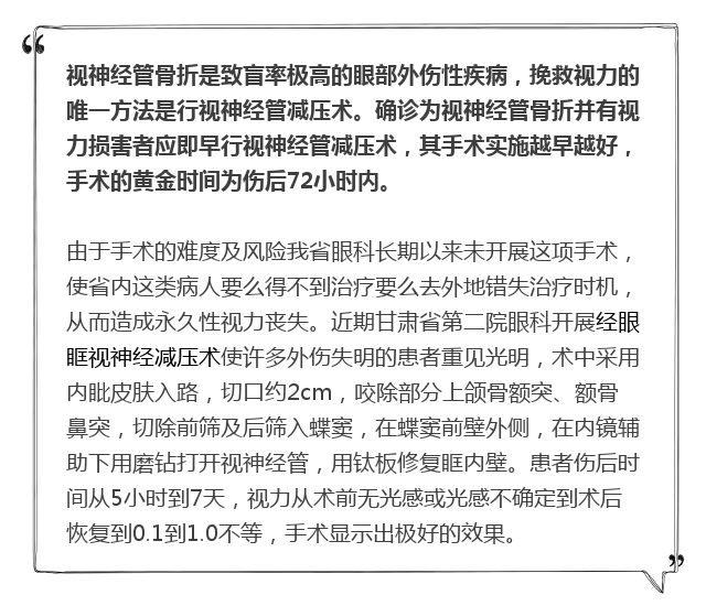 新闻中心 您的当前位置:首页 > 新闻中心 > 甘肃省二院眼科开展经 甘肃省二院眼科开展经眼眶视神经减压术使许多外伤失明的患者重见光明------2017-04-28 发布时间:2017-04-28 来源: 作者: 本文转自:薛尚才团队 原文链接 更多新闻请点击: http://www.yanke360.com/news/